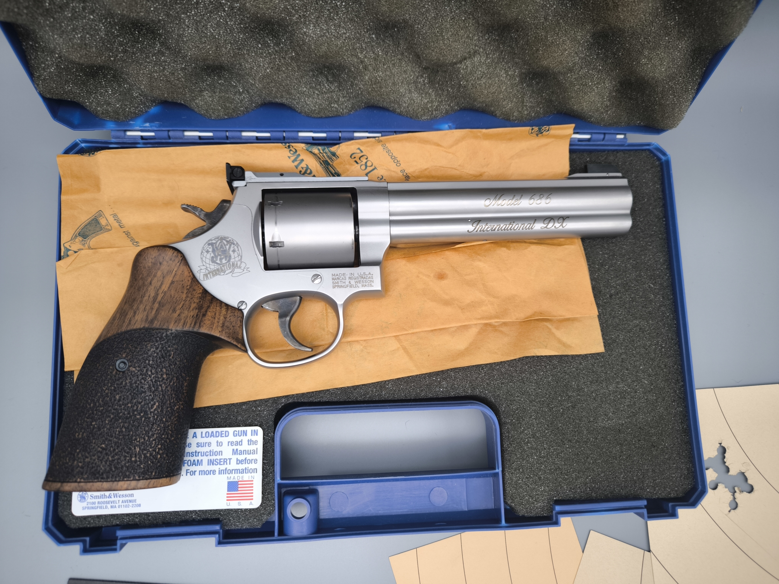 Gebrauchter Revolver S&W 686 in satiniertem Stainless im Kaliber .357Magnum. Ungeflutete Trommel mit 6 Schuss Kapazität. Strukturierter Holzgriff und verstellbarer Visierung. Dabei sind das Werksschussbild, der original Koffer, weitere Schussbilder und die Anleitung. Baujahr müsste 2001 sein laut Werksschussbild.
